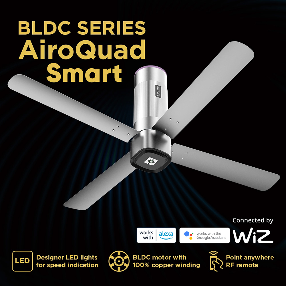 Ecolink AiroQuad Smart BLDC Ceiling Fan, features a powerful BLDC motor, maximizing energy savings and cooling performance. Connect the IoT fan to WiFi and control it with Philips WiZ App, your favourite voice assistants or given RF Remote. This not the standard EcoLink AiroQuad version, It is the ‘Smart’ variant equipped with WiFi Connectivity module to enhance the experience.