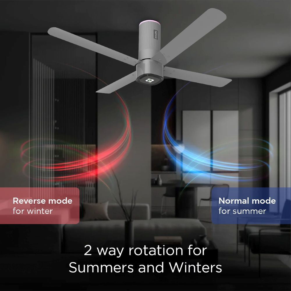 Why use a fan only in the summer? The Ecolink AiroQuad Smart BLDC Ceiling Fan features an innovative 2-way rotation system. In the summer, it pushes a cool breeze downwards. In the winter, activate the reverse mode to gently circulate warm air trapped near the ceiling, keeping your room cozy without the draft.