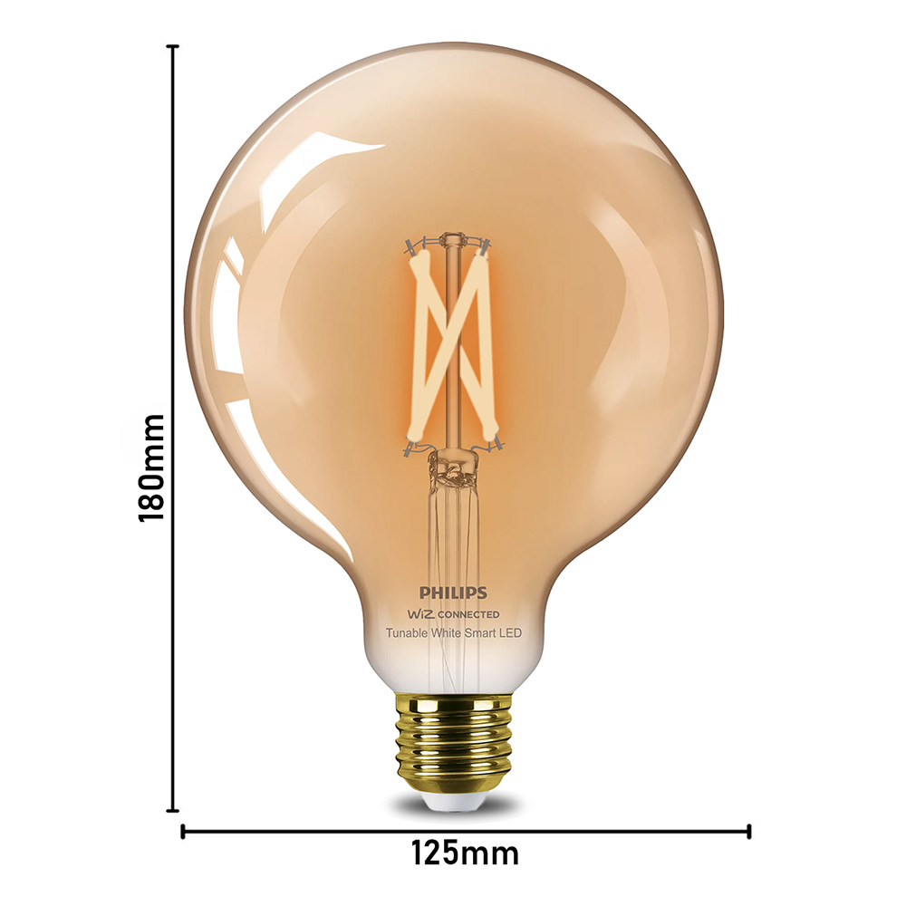Specification: Philips WiFi Filament Globe Amber Glass Bulb G125 – 7W, E27, Decorative Edison Style Smart LED, Tunable White, Dimmable (WiZ Connected | Matter Supported)