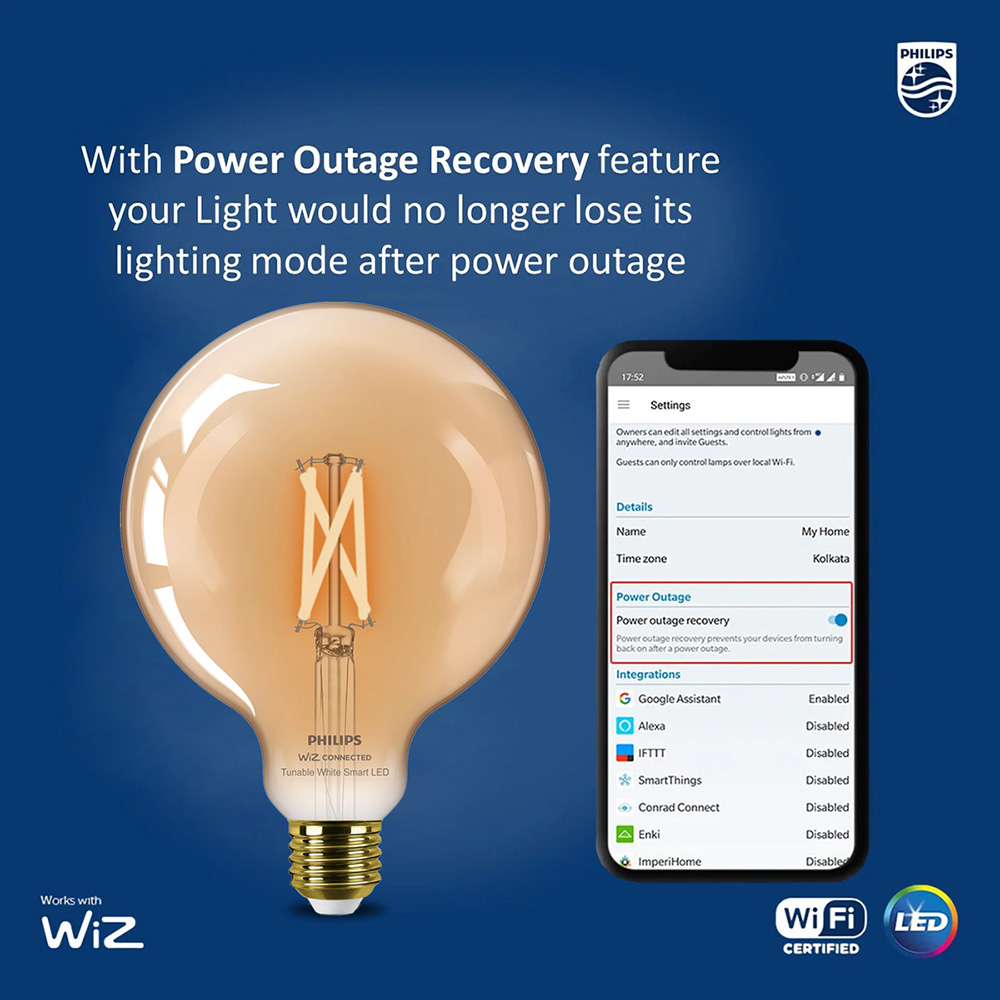 - Last Status Memory: If enabled, the Philips WiZ smart Filament LED stays in the same last power state after a power outage.