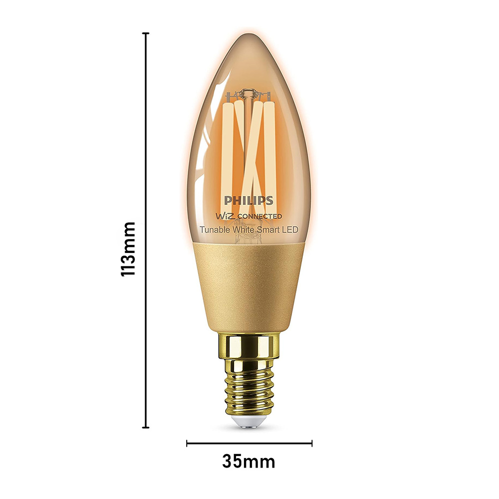 Specification: Philips WiFi LED Filament Candle Bulb (Amber) – TW 4.9W C35 E14 Base | 25W Eq. 370lm Vintage Style WiZ Smart Bulb (Tunable White, Dimmable)
